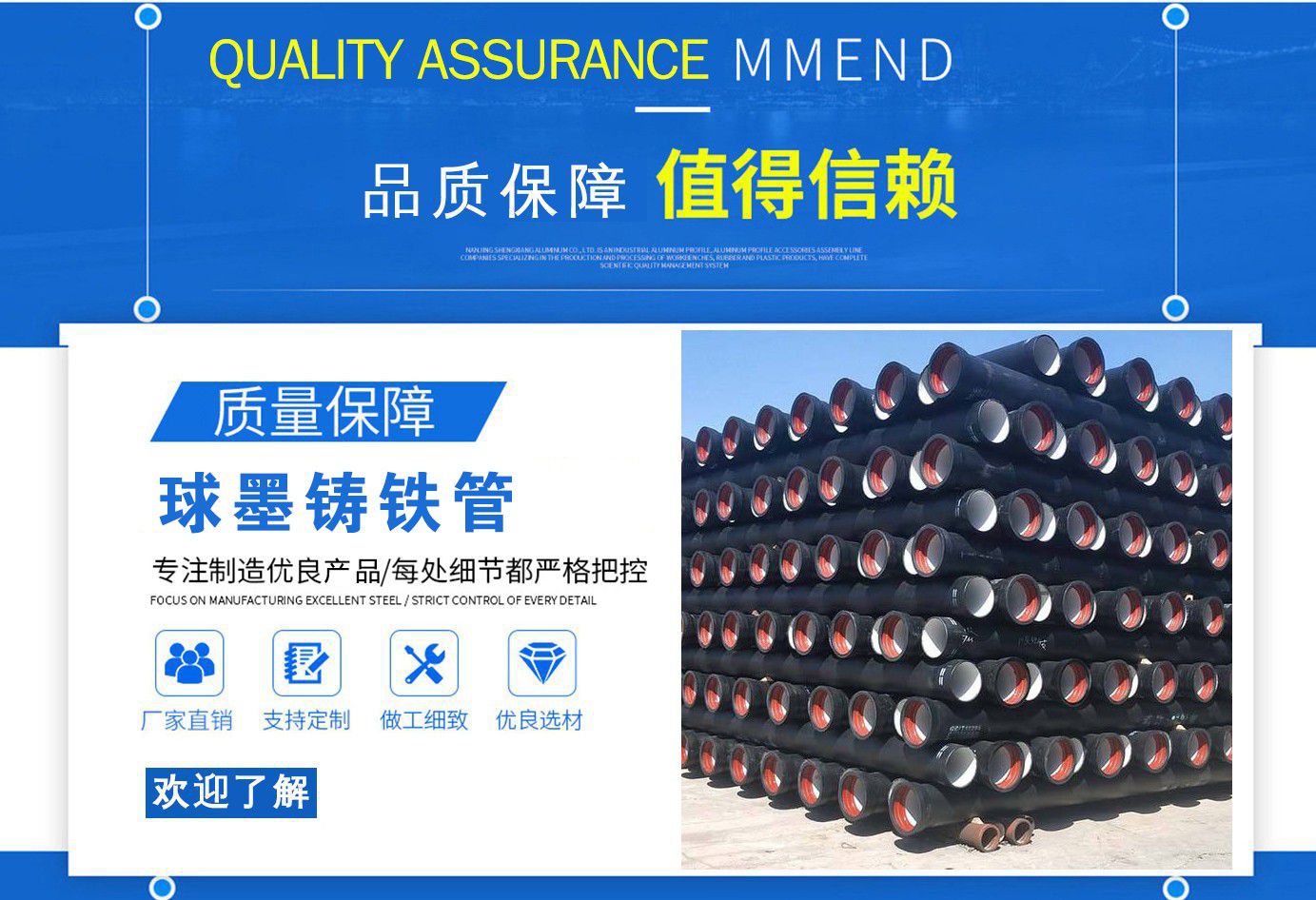 山西飛翔鑄業(yè)有限公司是一家以新興技術(shù)致力于研制開發(fā)、生產(chǎn)、銷售、施工安裝各種球墨管廠家,球墨鑄鐵管價格,國標(biāo)球墨管,k9球墨鑄鐵管,國標(biāo)球墨鑄鐵管,離心球墨鑄鐵管等系列鑄鐵產(chǎn)品。公司擁有完善的銷售、售后服務(wù)體系及一支由鑄造專家、工程師組成的精通產(chǎn)品設(shè)備和生產(chǎn)鑄造的技術(shù)力量隊伍。隨著企業(yè)的發(fā)展,我們積累了豐富的鑄造經(jīng)驗與科技水平。使得產(chǎn)品具有高強度、高韌性、耐腐蝕性強等性能。同時,我們獲得質(zhì)量管理體系認(rèn)證、產(chǎn)品質(zhì)量認(rèn)證、職業(yè)健康體系認(rèn)證、環(huán)境管理體系認(rèn)證。產(chǎn)品暢銷各地并打入韓國、新加坡等東南亞市場。 在未來的發(fā)展中,公司奉行誠信共雙贏,合作創(chuàng)盛世的企業(yè)理念。讓我們一起共創(chuàng)美好未來!  公司產(chǎn)品采用良好的工藝流程,以確保產(chǎn)品質(zhì)量的穩(wěn)定性:以良好的設(shè)備,確保質(zhì)量的可靠性。廣泛應(yīng)用于國內(nèi)外城市的市政建設(shè),通信,自來水,消防,園林,環(huán)保等行業(yè),產(chǎn)品大獲贊譽!  我們有多年的井蓋生產(chǎn)經(jīng)驗,多名老技術(shù)工人有將近二十年的生產(chǎn)經(jīng)驗,還聘請多名新技術(shù)研發(fā)人員,因為我們始終堅信質(zhì)量才是未來生存的根本,只有把質(zhì)量保證了,企業(yè)才會有更加美好的未來。公司堅持用心服務(wù),誠信為本,與時俱進(jìn),科技為先的企業(yè)理念,堅持科技先導(dǎo)、竭誠為廣大用戶服務(wù)。歡迎各界朋友蒞臨我公司參觀,指導(dǎo)洽談業(yè)務(wù),相信選擇我們就是選擇我們共贏的明天...